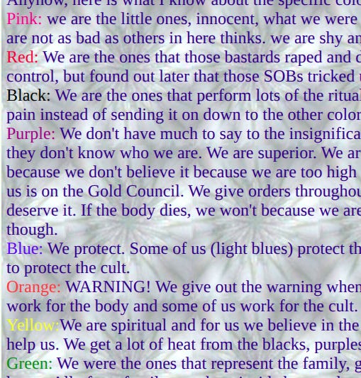 When they program with colors, they create peoples like us but give each a color so that we know what our job is and who inside is our friends and who is not. Also, when they (outside people) want us to do something, they know which color of people to call out to do that job. Color programming is usually one of the first programming to be done and therefore is done all over the world and starts at a very young age. This also allows any cult around the world who may not know any of your people by name to call up a certain group or color to do a certain job, with few problems and few surprises.